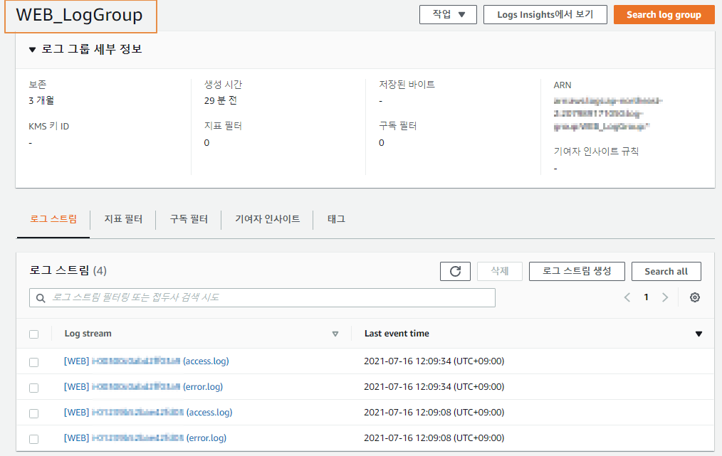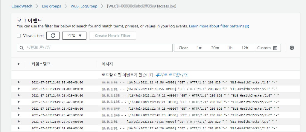 AWSCloudwatch Logs에서 정상적으로 로그가 수집되는 것을 보실 수 있습니다.