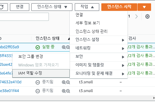 - EC2 인스턴스를 선택하고 보안 → IAM 역할 수정을 선택하여 위에서 생성한 Role을 연결합니다.